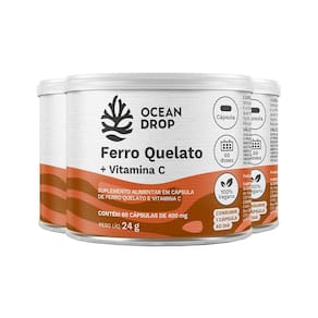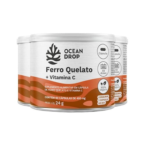 Kit 3 Ferro Quelato + Vitamina C Ocean Drop 60 Cápsulas O ferro desempenha múltiplas funções vitais, incluindo o transporte de oxigênio pela hemoglobina, essencial para o metabolismo celular. Além disso, está presente em enzimas e complexos moleculares que desempenham papéis cruciais no metabolismo energético e na síntese de DNA. Composição: - Ácido ascórbico vitamina C - Bisglicinato ferroso - Estabilizante: celulose microcristalina - Antiumectante: dióxido de silício e estearato de magnésio - Cápsula vegetal: Hidroxipropilmetilcelulose, água e extrato de cenoura roxa - NÃO CONTÉM GLÚTEN. Indicação: - Imunidade - Metabolismo - Anemia ferropriva anemia por deficiência de ferro Modo de consumo: - Sugere-se a ingestão de 1 cápsula ao dia ou conforme recomendação . Contraindicação: - Este produto é indicado para o grupo populacional maior de 19 anos. - Não deve ser consumido por gestantes, lactantes e crianças. - Este produto não é um . Marca: Não Informado Ean: 7908609532409