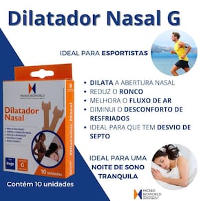 Kit 3 fita dilatador nasal tamanho g 10 unidades Kit 3 fita dilatador nasal tamanho g 10 unidades O que é fita dilatador nasal Fita nasal adesiva discreta, em dois tamanhos, destinada a dilatar o nariz para melhorar a respiração em caso de esporte, ronco, congestão nasal... de forma não medicamentosa. Indicações - abre as vias nasais facilitando e otimizando a respiração; - ideal para prática de esportes; - reduz o ronco e melhora o sono - combate a congestão nasal Vantagens - cor discreta - não medicamentoso Modo de uso: Uso externo - a pele deve estar limpa e seca para uma melhor aderência, cosméticos e outros produtos tópicos podendo interferir na aderência do produto sobre a pele. - após limpar e secar a área externa do nariz, colocar a fita dilatador nasal em cima do nariz, de modo que fique logo abaixo do osso e acima das narinas. Princípios ativos: N/a Modo de ação: - a fita dilatador nasal abre as vias nasais de forma mecânica, proporcionando maior fluxo de ar e melhor respiração. - ela ajuda em caso de desvio do septo. - a fita dilatador nasal facilita e otimiza a respiração nasal, é ideal para quem pratica exercício físico pesado ou até uma simples caminhada. - Utilizado durante a noite a fita dilatador nasal diminui a congestão nasal noturna e os roncos melhorando o bem-estar. - não contém podendo ser junto a qualquer tratamento medicamentoso. Apresentações: Disponível em embalagens com 10 e 30 unidades nos tamanhos médio e grande. Tamanho médio: 6616 mm Tamanho grande: 5516 mm Informações bibliograficas sobre os princípios ativos: As fitas adesivas dilatador nasal são um dispositivo projetado para ajudar a melhorar a respiração nasal. Elas são colocadas na ponta do nariz e exercem uma leve pressão para expandir os orifícios nasais, o que pode ajudar a aliviar a congestão nasal e a dificuldade de respirar. Uma revisão sistemática de 2017, publicada no international forum of allergy & rhinology, encontrou evidências de que as fitas adesivas dilatador nasal podem ser eficazes no alívio da congestão nasal e da dificuldade de respirar em indivíduos com rinite alérgica sazonal. Outro estudo, publicado no journal of asthma and allergy education, também encontrou que as fitas adesivas dilatador nasal podem ser eficazes no alívio da congestão nasal em indivíduos com rinite não alérgica. Além disso, as fitas adesivas dilatador nasal são seguras e fáceis de usar. Elas não possuem efeitos colaterais significativos e são uma opção de tratamento sem receita médica para a congestão nasal. Em resumo, as fitas adesivas dilatador nasal podem ser uma opção eficaz e segura para o alívio da congestão nasal e da dificuldade de respirar em indivíduos com rinite alérgica sazonal e não alérgica. Fontes: kim, h., cho, s., & kim, j. 2017 . efficacy of nasal dilator strips for seasonal allergic rhinitis: a systematic review. International forum of allergy & rhinology, 7 3 , 241-247. han, j. H., kim, j. H., & kim, j. H. 2015 . Nasal dilator strips for nasal congestion relief in nonallergic rhinitis: a randomized, placebo-controlled trial. journal of asthma and allergy education, 6 2 , 115-121. Composição: Polietileno microperfurado e adesivo acrílico hipoalergênico Contraindicações e precauções de uso Não é indicado para crianças menores de 5 anos. Não utilizar sobre a pele lesionada ou irritada Pessoas com alguma doença respiratória, deve consultar o médico antes de usar o produto. Em caso de irritação, suspenda o uso e procure orientação médica. Descarte após o uso. Conservação: Temperatura ambiente Anvisa: Produto não regularizado pela anvisa como dispositivo médico.