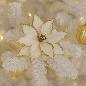 Com 18cm de diâmetro, a flor possui haste para fixação prática, garantindo firmeza e versatilidade na montagem. É ideal para composições natalinas refinadas e para criar arranjos únicos com um toque de requinte.