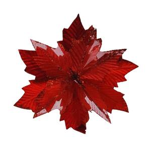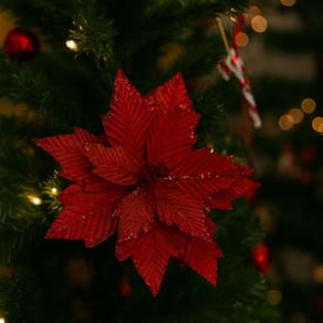 Transforme sua decoração de fim de ano em um espetáculo de luxo e brilho com esta flor bico de papagaio vermelha recortada com glitter – o detalhe que faltava para elevar sua árvore e composições natalinas.