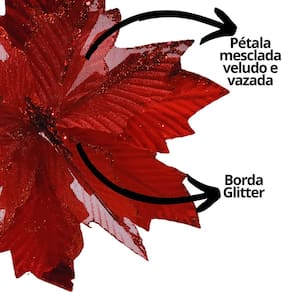 Destaque a sua decoração natalina com a flor bico de papagaio luxo, confeccionada em veludo vermelho premium com detalhes recortados e acabamento na borda em glitter brilhante. Seu design sofisticado adiciona requinte e luminosidade, tornando cada arranjo, guirlanda ou árvore de Natal ainda mais elegante.