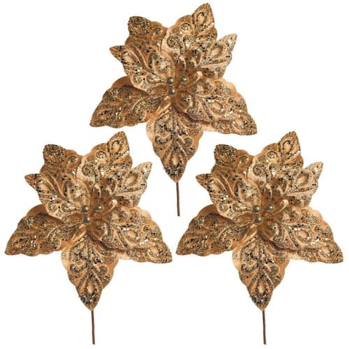 Kit 3 Flores Bico de Papagaio Arabesco Glitter Dourado 28cm