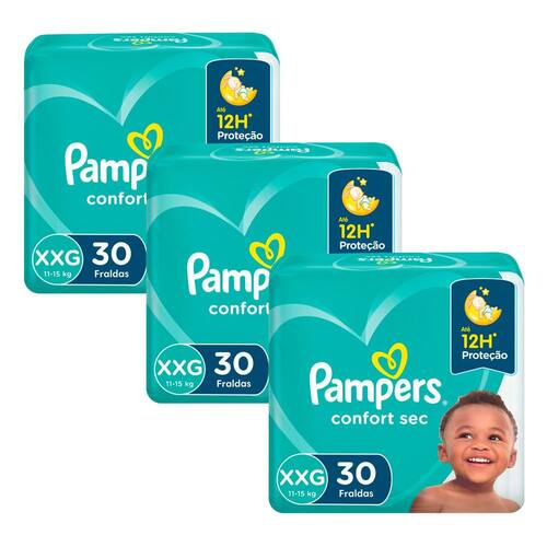 FRALDA PAMPERS CONFORT SEC PACOTE MEGA TAMANHO XXG Pampers Confort Sec com Extra Sec Pods - canais de ar! Permitem que o ar circule livremente dentro da fralda, para o bumbum ficar menos abafado, e a pele arejada e sequinha durante a noite. Até 2X mais seca, sem cair*: *versus fraldas comuns. Extra Sec Pods: Distribuem o xixi uniformemente, evitando que a fralda fique pendurada. Gel mágico: Absorve e retém a umidade no interior da fralda para noites mais sequinhas. Camada ultra-absorvente: Absorve rapidamente a umidade mantendo sequinha a pele do bebê. Barreira anti-vazamento: Adaptam suavemente ao redor das pernas do bebê. Ajuste flexível: Ajuste cômodo e flexível para dar uma proteção anti-vazamentos todas as noites. Exclusiva loção protetora: Ajuda a proteger a pele do bebê.