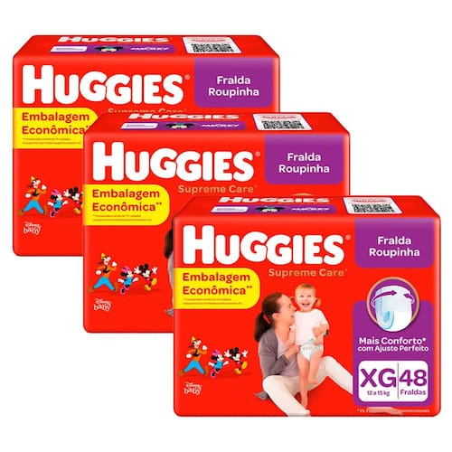 Fralda Huggies Proteção Acolchoada Pants Tamanho XG A Fralda Huggies Proteção Acolchoada Pants Tamanho XG, com 48 unidades, é ideal para bebês em fase ativa que precisam de proteção e conforto. Supreme Care Roupinha agora é Proteção Acolchoada: com o mesmo cuidado e proteção de sempre. Abraço confortável para barriguinha e perninhas. Previne marquinhas e oferece até 12 horas de proteção contra vazamentos*. Seu formato tipo roupinha é fácil de vestir e acompanha cada movimento do bebê. Com cintura super macia e melhor proteção de Huggies* é escolha ideal para quem busca conforto, praticidade e segurança em todos os momentos do dia. *Desempenho pode variar conforme hábitos, alimentação e características do bebê. **vs Huggies Rápida Absorção Ean: 7896007549726