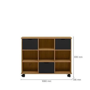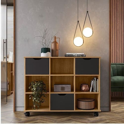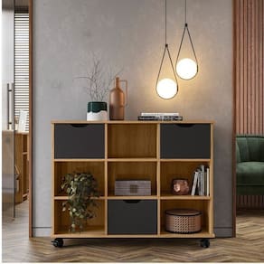 O Nicho Organizador é multifuncional, que pode ser utilizado em qualquer ambiente. Com 9 compartimentos internos, que contribuem para organização do local, o móvel possibilita a acomodação de diversos objetos. Incluso um kit com 3 gavetas, para melhor aproveitamento de sua divisão interna, que podem ser alocadas em qualquer compartimento do Nicho. Possui Rodízio: Sim Acabamento: Pintura UV Altura do Conjunto: 83 cm Ambiente: null Ambiente Principal: Sala de Estar Cor: Freijó/Preto Informação Complementar: 1x Kit 3 Gavetas Organizadoras Módulos e Complemento Preto Largura: 32,8 cm Altura: 23,2 cm Peso: 7,6 kg Profundidade: 30,8 cm Necessita Montagem: Sim
