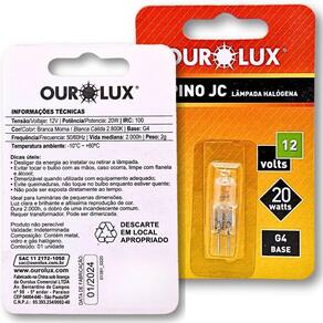 Kit 3 lampadas halogena bipino jc 20w 12v g4 - ourolux Lampadas halogena bipino jc 20w 12v g4 - ourolux Descrição do produto Transforme seu espaço com a potente lâmpada halógena bipino de 20w e 12v jc. Ideal para iluminar ambientes como salas, cozinhas e áreas externas, esta lâmpada oferece uma luz brilhante e clara, perfeita para destacar detalhes e criar atmosferas aconchegantes. Características principais - potência: 20w para uma luminosidade intensa. - voltagem: funciona em 12v, ideal para sistemas de baixa tensão. - base: bipino jc g4, fácil de instalar em diversas luminárias. - durabilidade: vida útil prolongada em comparação com lâmpadas incandescentes. - fabricante: ourolux - : 3 meses - tamanho do produto: 2,5cm altura x 5mm de largura - cor da luz: 3000k - validade: indeterminada - forma da lampada: vela - soquete: g4 ou gy6.35 - composição: metal, vidro e gás halógeno. Vantagens - proporciona uma luz clara e vibrante, ideal para realçar a beleza de seus espaços. - consumo eficiente de energia, ajudando você a economizar na conta de luz. - design compacto que se adapta perfeitamente a spots de iluminação e luminárias decorativas. Observações: produto com tensão de 12v. Não utilizar em lugares que possuem tensão 100-240v. Sugestão de uso: Oficinas mecânicas, baterias e embarcações. / utilizar em ambientes cobertos. Marca: Não Informado