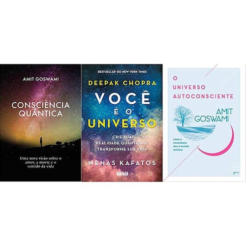 KIT 3 LIVROS Consciência Quântica + Você é o universo + O universo autoconsciente Consciência quântica: Uma nova visão sobre o amor, a morte e o sentido da vida Capa comum - 26 maio 2021Edição Português por Amit Goswami Autor Desde a Antiguidade, temas como a existência de Deus, a morte e o sentido da vida são explorados por diversas religiões e, mais recentemente, desprezados pelo materialismo científico. No entanto, essas duas visões de mundo mostraram-se incapazes de dar uma resposta satisfatória aos fenômenos da nossa existência. Enquanto as tradições religiosas submetem o mundo material a regras supostamente transmitidas por Deus, a ciência materialista suprime a espiritualidade e descarta tudo que não pode ser explicado pela lógica newtoniana.Detalhes do produtoEditora : Editora Aleph; 2 edição 26 maio 2021 Idioma : PortuguêsCapa comum : 248 páginasISBN-10 : 6586064767ISBN-13 : 978-6586064766Dimensões : 22.8 x 15.6 x 1.6 cmAno de publicação: 2021Autor: Amit GoswamiVocê é o universo: Crie sua realidade quântica e transforme sua vida Capa comum - 1 março 2017Edição Português por Deepak Chopra Autor , Menos Kafatos Autor , Maria Sylvia Corrêa Tradutor , Vera Caputo Tradutor Realidade em que você vive será sua para abraçá-la ou transformá-la. O que acontece quando a ciência moderna desafia tudo o que conhecemos sobre realidade Neste trabalho brilhante e atual, o best-seller Deepak Chopra e o reconhecido físico Menas Kafatos propõem uma nova aliança entre ciência e espiritualidade, entre física quântica e vida cotidiana, questionando nosso papel na construção da realidade em que vivemos. Trazem assim uma nova e inovadora compreensão de quem somos e de como podemos transformar o mundo enquanto atingimos nosso maior potencial.Detalhes do produtoEditora : Editora Alaúde; 1 edição 1 março 2017 Idioma : PortuguêsCapa comum : 288 páginasISBN-10 : 8578814215ISBN-13 : 978-8578814212Dimensões : 22.61 x 15.49 x 1.78 cmAno de publicação: 2017Autor: Deepak ChopraO universo autoconsciente: Como a consciência cria o mundo material Capa comum - 27 março 2007Edição Português por Amit Goswami Autor , Ruy Jungmann Tradutor Lançado originalmente em 1993, este livro abalou a comunidade ao apresentar uma teoria revolucionária. A partir dos princípios da física quântica, o autor demonstra que é a consciência, e não a matéria, a base de tudo que existe, resgatando a herança filosófica das grandes tradições religiosas e unindo mente e corpo num novo paradigma científico.Detalhes do produtoEditora : Editora Aleph; 3 edição 27 março 2007 Idioma : PortuguêsCapa comum : 368 páginasISBN-10 : 857657280XISBN-13 : 978-8576572800Dimensões : 22.8 x 16 x 2.2 cmAno de publicação: 2007Autor: Amit GoswamiCondição do item: NovoTipo de capa: ComumTipo de narração: ManualFormato: Papel