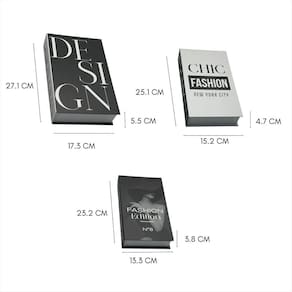 Transforme Seu Ambiente com Elegância e Estilo Dê um toque sofisticado à sua decoração com este Conjunto de Caixas Decorativas de Papel. Inspirado no universo fashion, cada peça apresenta um design exclusivo em preto e branco, trazendo glamour e modernidade para qualquer espaço. Um porta objetos que dará um destaque melhor e mais elegante em sua própria personalidade. Destaques do Produto: -Design refinado e temático de moda -Impressão de alta qualidade com detalhes elegantes -Perfeito para colocar objetos dentro de forma discreta e decorar estantes, prateleiras e mesas -Leve e fácil de posicionar em diferentes ambientes Seja para um home office mais estiloso, um quarto charmoso ou uma sala com personalidade, esse conjunto é a escolha ideal para quem busca beleza e sofisticação. Adicione um toque fashion ao seu espaço e impressione com um ambiente cheio de atitude e classe Especificações Técnicas:Cor: DesignMaterial: PapelCaixa 1 - Medidas Aproximadas: Altura: 3,8 cm x Largura: 13,3 cm Comprimento: 23,2 cmCaixa 2 - Medidas Aproximadas: Altura: 4,7 cm x Largura: 15,2 cm Comprimento: 25,1 cmCaixa 3 - Medidas Aproximadas: Altura: 5,5 cm x Largura: 17,3 cm Comprimento: 27,1 cmImagens IlustrativasComposição da Embalagem:3 Caixas Decorativas
