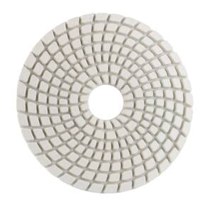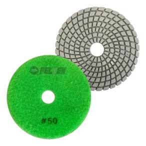 Informações técnicas: Cor: Verde Composição: Resina de alta performance e diamante industrial Diâmetro: 100mm 4'' Grão: 50 Indicado para: Desbaste inicial Superfícies aptas: Mármore, granito, cerâmica, concreto e porcelanato Velocidade de trabalho: 2.500 a 4.000 RPM Não mancha A seco e refrigerado