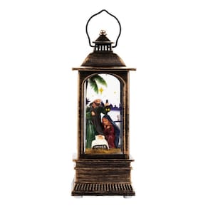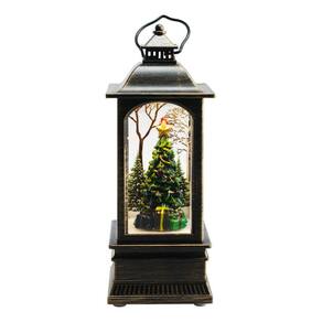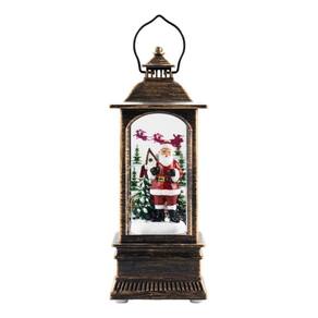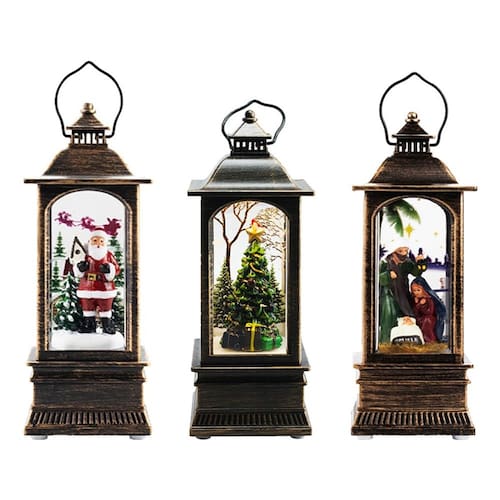 Luminária em forma de lamparina de 13 cm de altura. Interior com enfeite Natalino. Ao ligar, interior da lamparina se acende iluminando o enfeite. Funcionamento: 3 baterias AG13. Material: plástico
