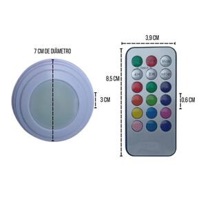 Kit Com 3 Luminárias Lâmpadas Redondas Adesivas A Pilhas RGB Coloridas Led Spots Sem Fio Com Controle Remoto Kit 3 Luminárias Lâmpadas Led Spot Sem Fio Com Controle Remoto, ideal para serem utilizadas em guarda-roupas, armários, gavetas, corredores, varandas, escritórios, quartos, estantes, cabeceiras de camas, toaletes, espelhos, nichos, closets, escadas, balcões, escrivaninhas e em vários locais que necessitam de iluminação colorida sem a necessidade de perfurações, parafusos e cabos. Especificações do produto: - Material: ABS - Formato da luminária: Redonda - Quantidade de led: 3 leds por luminária - Tensão: 4,5V Cada Spot - Fonte de Energia: 3 Três Pilhas AAA para cada spot Pilhas não inclusas - Cor do Produto: Branco - Cor da Luz: RGB Colorida - Potência: 1,2W / 50 LM Cada Spot - Medidas de cada spot: 7 x 3 cm - Medidas do Controle Remoto: 3,9 x 8,5 x 0,6 cm - Modelo da bateria do controle remoto: CR2025 - Distância do controle remoto: Até 5 metros - Peso total de cada kit 3 luminárias: Aproximadamente 130 gramas Atenção: Esse produto não é a prova de água, e também, não deverá ser instalado em lugar úmido, caso contrário, o produto será danificado. Manual Rápido - Coloque 3 pilhas AAA em cada luminária - Solte o lacre Fita transparente do controle remoto para sua operação - Solte e cole um dos lados do adesivo dupla face e fixe na luminária, por fim solte a outra parte do adesivo e fixe no lugar desejado. Observe se o lugar está limpo e adequado para a fixação. - As cores poderão ser operadas de duas maneiras: Uma apertando no centro da luminária ou pelo controle remoto Funções do controle remoto: ON Liga OFF Desliga Multi Color Fica trocando de cores automaticamente TIMER Controla as horas que ficará ligada diretamente MODE Muda a intensidade da cor branca para fraca e forte - Quando o controle não tiver mais funcionando a bateria deverá ser substituída Itens inclusos: - 3 Luminárias spot RGB - 1 Controle remoto - Kit 3 adesivos para fixações das luminárias