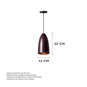 Características: - pendente modelo bala - dimensões: 22x13cm - canopla redonda de 11cm de diâmetro - produto feito em alumínio - 150cm de fio - pronto para instalação - utilize a lâmpada que desejar - soquete e-27 - garantia de 6 meses contra defeitos de fabricação - lâmpadas não inclusas neste produto.