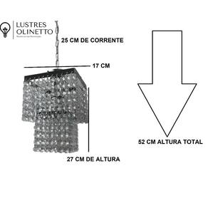 Base Quadrada em metal Cromado, 2 Camadas. Altura 27 cm + 25 cm corrente = 52 cm pode instalar diretmanete no teto Castanha: 804 de 14mm em cristal acrilico alto brilho Lampada: 1 x E27 Bivolt Peso Aprox. 1.0 Kg