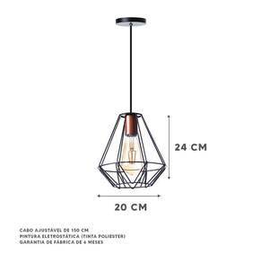 Kit 3 Lustre Pendente Interno Aramado Cristal 24Cm Cobre Deixe sua casa muito mais moderna e sofisticada com os pendentes da Ideallume. O produto não enferruja nunca. Ele é ideal para ser utilizada em áreas internas em cima da sua mesa, balcao gourmet, balcao da sua churrasqueira. Sua pintura eletrostática é extremamente resistente a maresia, o que confere extrema proteção e durabilidade ao item. Com esse produto você dará um toque de beleza que valoriza sua casa. Especificações Técnicas: Marca: Ideallume Modelo: AramadoFixação: TetoTipo de uso: Interno Pintura: Eletrostática - Tinta: microtextura poliéster Cor: PretoVoltagem Do Pendente: Bivolt 110/220v Soquete: E27 Medidas L x A x D : 17 x 23 x 17 cm Lâmpada: Utiliza 1 lâmpada Não inclusa Conteúdo Da Embalagem: 03 Pendentes Aramado Bala +3 Fios 1.5m + 3 Canoplas