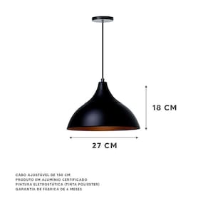 - dimensões: 18x27cm - canopla redonda de 11cm de diâmetro - produto feito em alumínio - 150cm de fio ajustável - pronto para instalação - utilize a lâmpada que desejar - soquete e-27 - garantia de 6 meses contra defeitos de fabricação