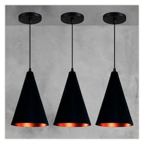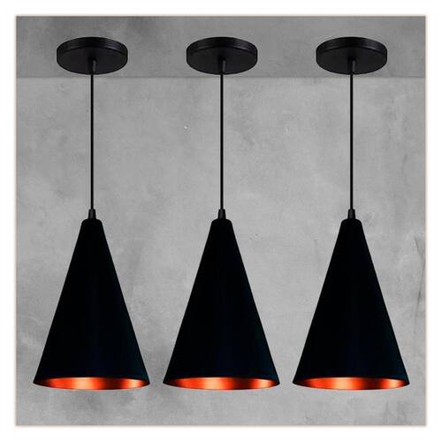 Kit 3 Lustres Pendente Cone em Alumínio Preto Fosco e Cobre Anúncio referente ao kit de 3 luminárias.