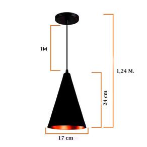 Lustre Pendente Modelo: Cone Cor: Preto Com Interior Cobre Medidas Aproximadas: Altura: 24cm Diâmetro: 17 cm Canópla de teto: 12 cm Soquete e-27 plástico Material: alumínio Marca R.R.J.V Negócios O pendente acompanha 1 Um Metro de fio com altura ajustável. Marca: R.R.J.V. Negocios Ean: 7898970122098