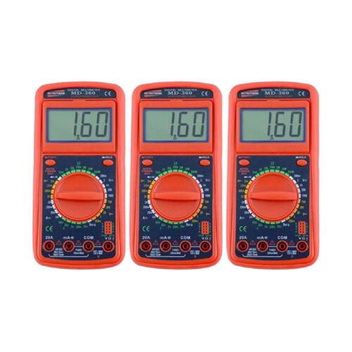 KIT 3 MULTÍMETRO DIGITAL MOD.MD-360 3½ DÍG. PARA TENSÃO, CORRENTE, RESISTÊNCIA, CAPACITÂNCIA, DIODO E TRANSISTOR (HFE) DESCRIÇÃO: Multímetro digital mod.md-360 3½ díg. para tensão, corrente, resistência, capacitância, diodo e transistor (hfe) ESPECIFICAÇÕES TÉCNICAS: Display: LCD 3 ½ dígitos 2000 contagens Display inclinável até 90º Taxa de amostragem: 2/3 vezes por segundo Tensão DC: 200mV, 2V, 20V, 200V, 1000V Resolução: 100mV, 1mV, 10mV, 100mV, 1V Precisão: ± 0,5% da leitura + 1 dígito Tensão AC: 200mV, 2V, 20V, 200V, 750V Resolução: 100mV, 1mV, 10mV, 100mV, 1V Precisão: ± 0,8% da leitura + 3 dígitos Corrente DC: 2mA, 20mA, 200mA, 20A Resolução: 1µA, 10µA, 100µA, 10mA Precisão básica: ± 1,3% da leitura + 1 dígito Corrente AC: 2mA, 20mA, 200mA, 20A Resolução: 1µA, 10µA, 100µA, 10mA Precisão básica: ± 1,9% da leitura + 3 dígitos Resistência: 200?, 2K?, 20K?, 200K?, 2M?, 20M?, 200M? Resolução: 0,1?, 1?, 10?, 100?, 1k?, 10k? Precisão básica: ± 1% da leitura + 2 dígitos Capacitância: 20nF, 200nF, 2mF, 20mF, 50mF Precisão: ± 2,5% de leitura + 1 dígito. Tempo de Resposta: 2 a 3 vezes por segundo Zero automático de medição de capacitância Botão Hold: Congelamento de leitura das escalas Teste de diodo, transistor (hFE) 0~1000 e continuidade audível (Bip) Indicação de sobre-escala: "1" aparece no display Indicação automática de polaridade negativa Indicação de bateria fraca Temperatura de Operação: 0 a 40ºC Temperatura e umidade de armazenamento: -10º a 50ºC / 75% Categoria de Segurança: CAT II – 600V CAT III - 220V Alimentação: 1 Bateria de 9V Dimensões: 88 x 172 x 36mm Desligamento automático Peso: 340g ACESSÓRIOS FORNECIDOS: 3 - Multímetro MD-360 3 - Bateria de 9V 3 - Holster 3 - Pontas de prova Manual de instruções