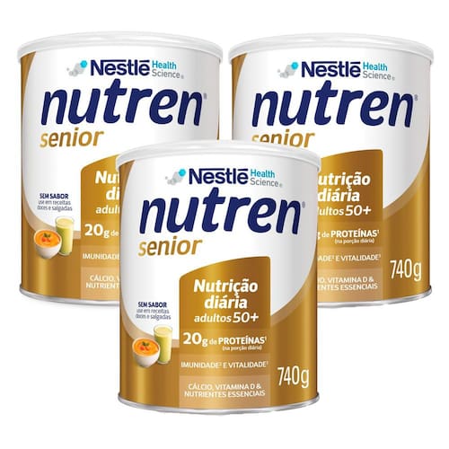 Composto Lácteo Nutren Senior Sem Sabor 740g NUTREN Senior é o suplemento nutricional da Nestlé desenvolvido pensando nas necessidades de quem já passou dos 50 anos e ainda tem muito o que aproveitar. Contém ACT-3, combinação única de cálcio, proteína e vitamina D, além de fornecer outras vitaminas e minerais. NUTREN Senior é versátil, pois não tem sabor. Pode ser misturado em receitas salgadas e doces. Nutren Senior, a melhor fase da vida é agora! Indicação: Desenvolvido pensado nas necessidades nutricionais de quem já passou dos 50 anos e ainda tem muito o que aproveitar. Modo de Preparo: Adicionar 6 colheres de sopa rasa (55g) a água e mexa bem. NUTREN® Senior não tem sabor, por isso pode ser adicionado ao final das receitas doces ou salgadas de sua preferência. Não pode ser fervido. Validade: Data de validade indicada no fundo da embalagem Ingredientes: Leite em pó desnatado, maltodextrina, proteína isolada do soro de leite da vaca, caseinato de cálcio obtido do leite da vaca, gordura láctea, frutooligossacarídeos, inulina, minerais (citrato de cálcio, carbonato de magnésio, sulfato ferroso, sulfato de zinco, fosfato de cálcio tribásico, sulfato de mangânes, sulfato de cobre e selenato de sódio), vitaminas (L-ascorbato de sódio, bitartarato de colina, acetato de DL-alfa-tocoferila, mio-inositol, colecalciferol, acetato de retinila, niacinamida, D-pantotenato de cálcio, tiamina mononitrato, cloridrato de piridoxina, filoquinona,riboflavina, ácido N-pteroil-L-glutâmico, cianocobalamina e D-biotina) e emulsificante lecitina de soja. NÃO CONTÉM GLÚTEN. ALÉRGICOS: CONTÉM DERIVADOS DE LEITE E SOJA. Sabor: Sem Sabor País de Origem: Brasil Frase Obrigatória: NÃO CONTÉM GLÚTEN. Modo de Conservação: Iniciado o uso do produto recomenda-se o consumo em até 30 dias. Consumir imediatamente após o preparo. Manter a lata sempre bem fechada em local seco, fresco e inodoro. Alergênicos: NÃO CONTÉM GLÚTEN. ALÉRGICOS: CONTÉM DERIVADOS DE LEITE E SOJA.