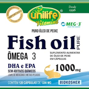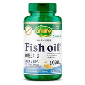 Kit 3 Óleo de Peixe Fish Oil Unilife 120 capsulas 1000mg O Óleo de Peixe Fish Oil Unilife é um suplemento que contém 1000mg de óleo de peixe por cápsula. Cada frasco contém 120 cápsulas. É um suplemento BIOKOSHER, desenvolvido a partir do processo de extração do óleo de peixe. Livre de glúten. Características: 1000mg de óleo de peixe por cápsula. 120 cápsulas por embalagem. Este produto é uma opção prática para incluir óleo de peixe na dieta diária. Modo de uso Sugere-se a ingestão de 1 a 2 cápsulas 2 vezes ao dia após as principais refeições. Ingerir com líquido. Este produto não é um . Não exceder a recomendação diária de consumo indicada na embalagem. Manter fora do alcance de crianças. Ingredientes Óleo de peixe. Cápsula: gelatina bovina, umectante glicerina e água. Registro: Produto autorizado para comercialização em todo o território nacional através do anexo I da RDC 240/2018 da ANVISA. AFE do MS 6.02234-1. Marca: Não Informado Ean: 7908609547830