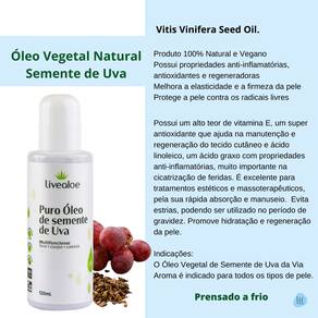 Puro Óleo de Semente de Uva possui elevado teor de alfa-tocoferol (vitamina E), ácido linoléico e ácido palmítico, os quais são responsáveis pela proteção contra radicais livres, regeneração, manutenção e revitalização da pele. Uso capilar, facial e corporal.