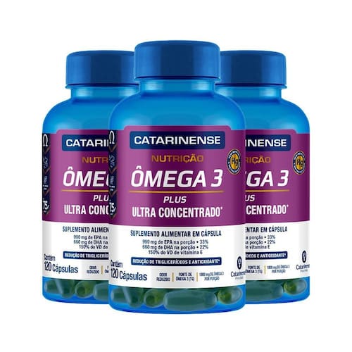 Kit 3 Ômega 3 Concentrado Catarinense 120 capsulas O produto Ômega 3 Concentrado Catarinense em cápsulas é um suplemento alimentar que contém ácidos graxos essenciais, como EPA e DHA, e vitamina E. Aqui está uma descrição detalhada das suas principais características: Finalidade de Uso: EPA 990 mg por porção : Auxilia na redução dos níveis de triglicérides no sangue, contribuindo para a saúde cardiovascular. DHA 660 mg por porção : Importante para a saúde cerebral e ocular. Vitamina E 150% do Valor Diário recomendado : Atua como um antioxidante, protegendo as células contra os danos causados pelos radicais livres. Consumo Recomendado: Dose diária: 3 cápsulas ao dia. Ingredientes: Óleo de Peixe: Fonte de EPA e DHA. Vitamina E Acetato de DL Alfa Tocoferol . Cápsula: Composta por água purificada, gelificante gelatina bovina INS 428 e umectante glicerina INS 422 . Informações Adicionais: Alergênicos: Contém derivados de peixe e pode conter soja. Não contém glúten. Este suplemento é indicado para quem deseja complementar a dieta com ômega 3 e vitamina E, visando benefícios cardiovasculares e antioxidantes. Produto dispensado de registro de acordo com a RDC 27/2010. Marca: Não Informado