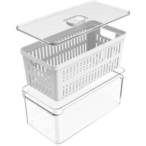 F6308 ASPEN DECOR DESCRIÇÃO Kit 3 Organizadores De Geladeira Com Escorredor 5L Caixas Plásticas Para Legumes Clear Fresh. O Jogo de 3 Organizadores de Geladeira 5 litros com Cesto Escorredor da linha Clear Fresh é ideal para aproveitar melhor os espaços da sua geladeira e manter os alimentos refrigerados e bem conservados, garantindo refeições frescas e o bem estar de sua família. As caixas plásticas para legumes, frutas e saladas possuem diversas funções para trazer mais frescor à geladeira, tais como: o sistema de ventilação e umidade controlada pelo respiradouro e sua cesta de drenagem que evita que os alimentos fiquem molhados permitindo o fluxo de ar e evitando o ressecamento e deterioração precoce dos alimentos. Empilhe, encaixe e crie diversas composições. organizadores De Geladeira Com Respiradouro E Cesto Escorredor caixas De Armazenamento Para Legumes Saladas E Frutas conjunto Linha Clear Fresh Peso: 1,770Kg Cores: Natural e Branco Dimensões De Cada Organizador: 30cm C x 15cm L x 13cm A Capacidade De Cada Organizador: 5 Litros. Conteúdo: 2 Organizadores de geladeira com cesto de drenagem. 1 Organizador de geladeira com 3 cestos de drenagem Limpeza e Cuidados: - Lavar com água e sabão neutro utilizando esponja macia, seguido de pano seco; - Não utilizar produtos químicos ou abrasivos na limpeza. Evitar batidas. Detalhes do Produto: - Possuem cestos de drenagem que evitam que os alimentos fiquem molhados e os mantem longe das paredes externas, permitindo o fluxo de ar; - Possuem respiradouros reguláveis que permitem ventilação e elimina os gases produzidos pelos alimentos, evitando decomposição precoce; - Não suportam máquina de lavar; - Não suportam micro-ondas; - Livres de Bisphenol A; - Não suportam freezer; - Suportam geladeira; - Empilháveis. Material: - Polipropileno: Material com alta resistência a impactos e ao calor. Não transfere odor, nem gosto aos alimentos. Atóxico, pode entrar em contato com alimentos. Resistência à água fervente, suportando até 150 C; - Poliestireno: Material translúcido com baixa Resistência a impactos. Ótima transparência e alto brilho. Não transfere odor, nem gosto aos alimentos. Atóxico, pode entrar em contato com alimentos. Marca: Não Informado