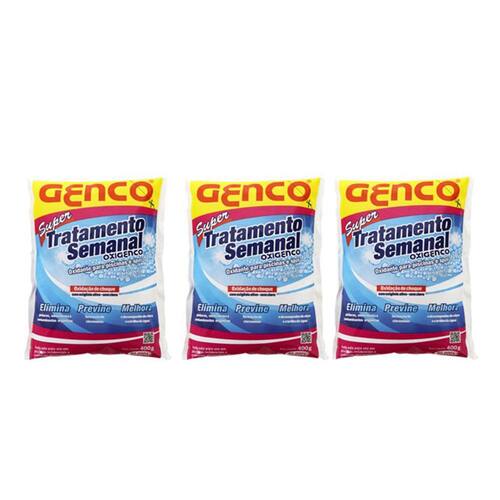 Super tratamento semanal oxigenco é um agente oxidante para águas de piscinas e spas que utilizam cloro e que necessitam de oxidação frequente para destruir os poluentes que consomem o residual de cloro livre, causam turbidez na água, odores desagradáveis e irritação da pele e dos olhos. Vantagens:- Oxidação de choque: destrói contaminantes orgânicos.- Elimina a oleosidades da água, destrói contaminantes orgânicos e restaura o brilho da água de piscinas e spas.- Melhora a eficiência do cloro.- Restaura o brilho e diminuí a formação de espumas da água em spas.- Trata 40.000 Litros. - Oxigênio ativo.- Previne a formação de cloraminas.- Tratamento semanal- Indicado para todos os tipos de piscinas fibra, vinil ou alvenaria .Instruções de uso:1 Com a filtração ligada adicionar, diretamente sobre a superfície da água, 400 g / 40 m 400 gramas por 40 mil litros de água de oxigenco. Em seguida adicionar 1,5 mL / m 1,5 mililitros por 1000 litros de água de clarificante Genfloc.2 Em piscinas muito utilizadas coletivas poderão necessitar de dosagens maiores, 1.000 g / 40 m 1.000 gramas por 40 mil litros de água .Manter a filtração ligada pelo tempo necessário para que toda água da piscina passe pelo filtro. Esse tratamento pode ser feito semanalmente. Item incluso:3 Saco de Oxigenco Tratamento Semanal.