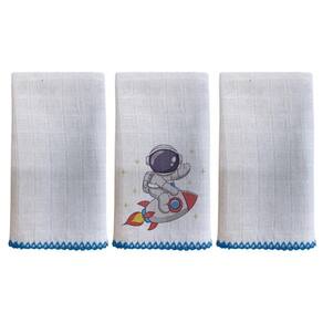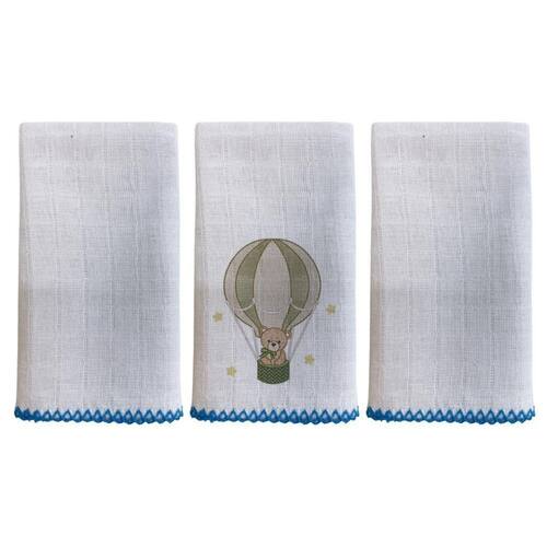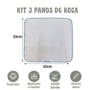 Kit com 3 unidades, sendo 2 Lisos Branco e 1 Bordado Bainha em crochê feito a maquina não desfia Composição: 100% algodão, tecido fralda Tecido quadriculado Tamanho: 33cm x 33cm Fabricação própria