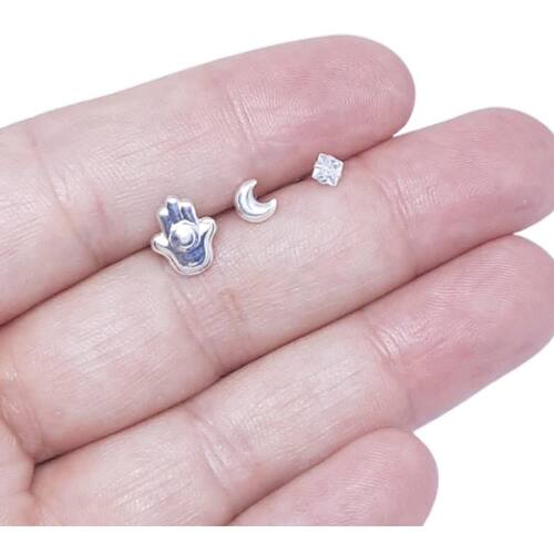 Kit 3 Pares de Brinco Prata 925, Mão de Fátima, Lua e Zircônia 3mm