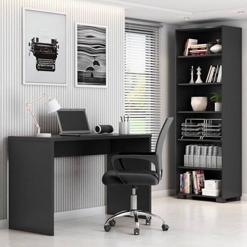 O Conjunto é composto por uma cadeira, uma escrivaninha e uma Estante para Livros feitos com MDP para dar aquele ar de robustez e beleza. É a combinação perfeita e versátil para seu home office, combinando também com vários ambientes, desde um simples local para estudos até um escritório. A Mesa para Escritório possui design simples e elegante; O livreiro é ideal para guardar e ajudar a organizar os seus livros com 5 prateleiras (sendo 3 removíveis), tudo para deixar o seu ambiente harmonizado. As peças possuem as seguintes medidas: Escrivaninha Multiuso 16443.135: 75x127x53cm (AxLxP) Estante 16449.135: 189x63x39cm (AxLxP) Acabamento: Pintura UV Altura do Conjunto: 188 cm Ambiente: null Ambiente Principal: Escritório Cor: Preto Informação Complementar: 1x Escrivaninha Gávea Office 127cm Preto Black Largura: 127 cm Altura: 75 cm Peso: 25 kg Profundidade: 53 cm Necessita Montagem: Sim