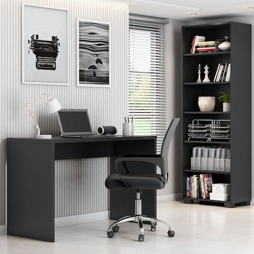 O Conjunto é composto por uma cadeira, uma escrivaninha e uma Estante para Livros feitos com MDP para dar aquele ar de robustez e beleza. É a combinação perfeita e versátil para seu home office, combinando também com vários ambientes, desde um simples local para estudos até um escritório. A Mesa para Escritório possui design simples e elegante; O livreiro é ideal para guardar e ajudar a organizar os seus livros com 5 prateleiras (sendo 3 removíveis), tudo para deixar o seu ambiente harmonizado. As peças possuem as seguintes medidas: Escrivaninha Multiuso 16443.135: 75x127x53cm (AxLxP) Estante 16449.135: 189x63x39cm (AxLxP) Acabamento: Pintura UV Altura do Conjunto: 188 cm Ambiente: null Ambiente Principal: Escritório Cor: Preto Informação Complementar: 1x Escrivaninha Gávea Office 127cm Preto Black Largura: 127 cm Altura: 75 cm Peso: 25 kg Profundidade: 53 cm Necessita Montagem: Sim
