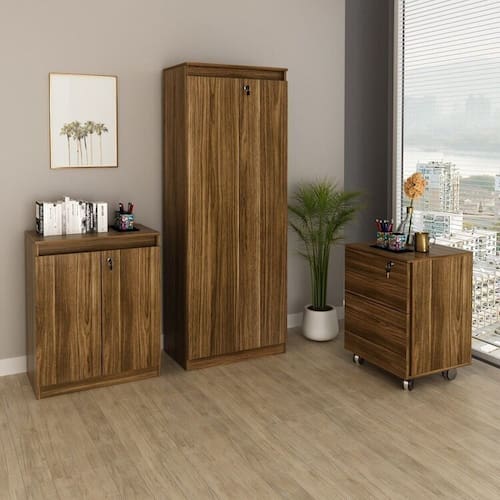 O Armário alto para escritório ME4151 é produzido em MDP 15mm contém 2 portas e 3 prateleira. Excelente opção para Organização e praticidade para seu escritório, com chave nas portas, para guardar documentos com mais segurança. Acabamento: Finish Foil Altura do Conjunto: 160.5 cm Ambiente: null Ambiente Principal: Escritório Cor: Nogal Informação Complementar: 1x Gaveteiro com Chave 3 Gavetas Charme Nogal Largura: 48,8 cm Altura: 64,5 cm Peso: 19,15 kg Profundidade: 43 cm Necessita Montagem: Sim