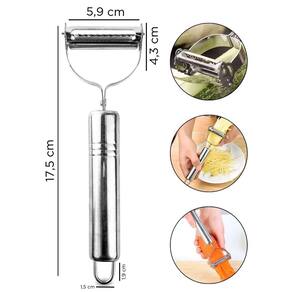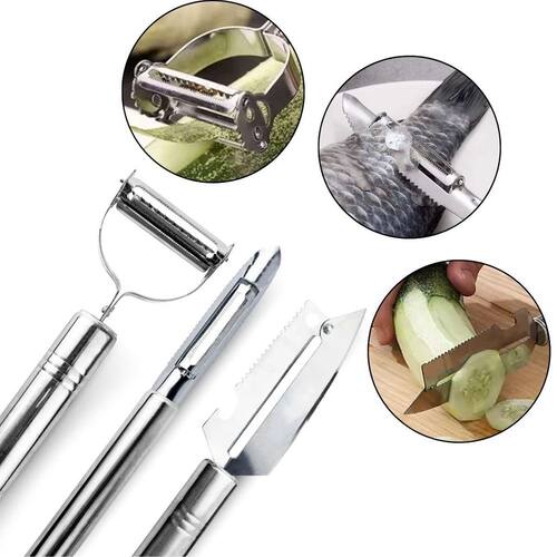 Composto por 3 Descascadores, Cortadores, Fatiadores Multifuncionais de Aço Inox, dentre de suas utilidades estão, bolear legumes e verduras, descascar, ralar, fatiar, cortar e muito mais.