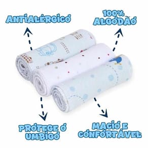 Kit com 3 Faixas Flaneladas neutras estampada ótimo para cuidar do cordão umbilical do seu bebê, além de ser frágil, ele precisa de cuidado especiais. Deve ser mantido sempre bem limpinho e seco para evitar infecções e bactérias, esta se torna a principal função da faixa umbilical, pois auxilia nestes cuidado, sempre lembrando, é claro, não se deve aperta a faixa, qualquer dúvida pergunte ao pediatra do bebê. Composição: 100% algodão Dimensões: 80cm x 10cm Imagem meramente ilustrativa. A cor e tom do produto pode variar de acordo com o seu dispositivo de acesso OBS: Acompanha 3 faixas . Produto enviado em menos de 24hrs após o pedido aprovado Cor: Azul / Masculino Material: Tecido Composição: 100% Algodão Estampa: Desenho Animado Tipo: Fraldas de pano para bebês Instruções de manutenção: Lavar à mão, não lavar a seco Marca: Não Informado