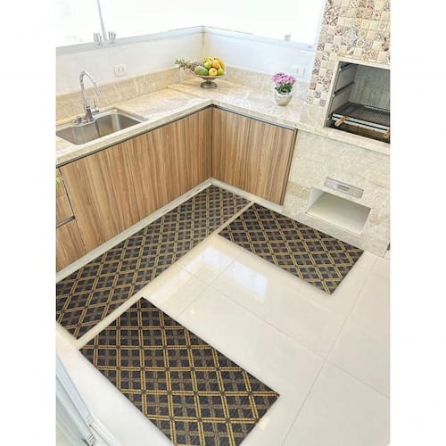 Composição do Kit:- 1 Passadeira de 0,50 x 1,50 m perfeita para frente da pia ou bancadas maiores- 2 Tapetes de 0,50 x 0,75 m ideais para frente do fogão e da geladeiraAs três peças combinam entre si, formando um conjunto harmonioso que protege o piso e valoriza a decoração do ambiente.