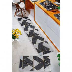 Composição do Kit:- 1 Passadeira em Manta Vinílica de 0,50x1,50 ideal para frente da pia ou balcão- 2 Tapetes Menores de 0,50x0,75 cada perfeitos para frente do fogão e da geladeiraAs três peças formam um conjunto harmônico que protege o piso e melhora o visual da sua cozinha sem sobrecarregar o ambiente.