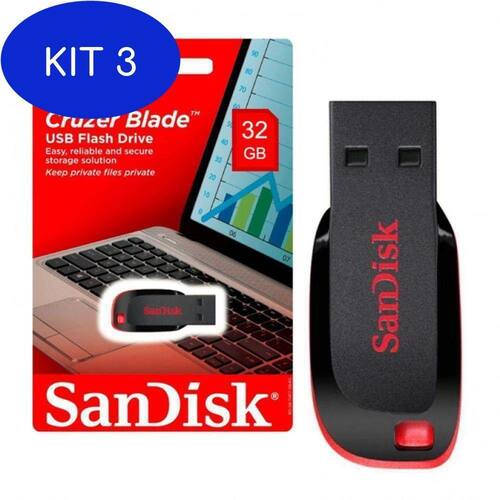 Pen Drive Sandisk 32GB Cruzer BladeCom design compacto, elegante e alta capacidade, o Pendrive Cruzer Blade facilita fazer back-up, transferir e compartilhar seus arquivos. Esse drive USB permite que você carregue fotos, filmes, músicas e dados pessoais aonde você for.Cor: pretoMedida do produto: 4x2x0,5cmCONTEÚDO DA EMBALAGEM: 3 Pen Drive 32Gb - Sandisk - Cruzer Blade