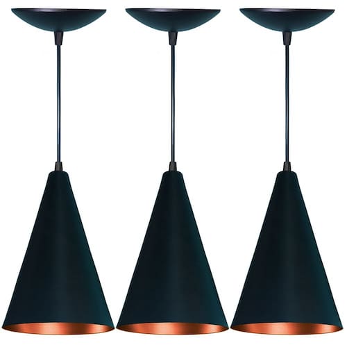 Adquira agora mesmo o Kit 3 Lustres Pendente Cone em Alumínio Preto Fosco e Cobre e transforme a iluminação do seu ambiente com estilo e elegância.