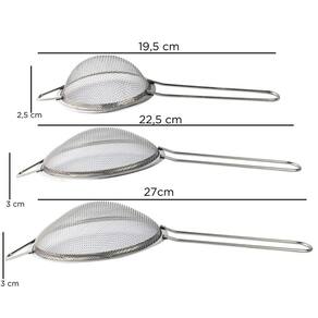 1. Peneira Pequena Diâmetro: 8 cm - Ideal para polvilhar ingredientes secos como açúcar de confeiteiro, cacau em pó ou especiarias. - Perfeita para coar líquidos em pequenas quantidades, como sucos, chás e etc. - Tamanho compacto facilita o armazenamento e o manuseio em tarefas menores. 2. Peneira Média Diâmetro: 10 cm - Ótima para peneirar ingredientes como farinha, fermento em pó ou grãos. - Adequada para coar caldos, molhos ou separar sólidos de líquidos durante a preparação de suas receitas. - Tamanho versátil, ideal para uso diário na cozinha. 3. Peneira Grande Diâmetro: 12 cm - Perfeita para peneirar grandes quantidades de ingredientes como farinha para massas e bolos. - Excelente para lavar e coar frutas, legumes e verduras. - Tamanho amplo permite peneirar e coar com rapidez e eficiência, facilitando o preparo de grandes receitas.