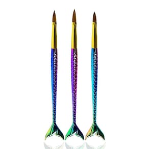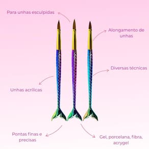 O Kit Pincéis Sereia para Alongamento de Unhas, foi projetado com materiais de alta qualidade, cerdas resistentes e precisas. Desenvolvidos para aplicação de material nas unhas, eles tem a ponta com formato fino na extremidade. Eles proporcionam precisão e controle durante a aplicação dos materiais, garantindo um acabamento . Unhas de Gel - Permitem distribuir e modelar o gel com precisão, ajudando a criar um formato uniforme e suave. Unhas de Fibra de Vidro - Facilitam a aplicação do gel sobre a fibra, garantindo que ela fique bem encapsulada e nivelada. Unhas de Porcelana Acrílico - Ajudam a moldar a mistura de pó acrílico e monômero, garantindo uma estrutura forte e natural. Unhas de Acrygel - Combinam a precisão necessária para modelar o produto, ajudando a nivelar e suavizar a superfície da unha. Acabamento e Detalhes - Ideais para esculpir pontos delicados, criar curvas perfeitas e definir áreas de alongamento. Seu maior diferencial são seus cabos, que além de um design lindo, possui relevo nas escamas oque não permite que escorreguem das mãos e sejam confortáveis de segurar por muito tempo.