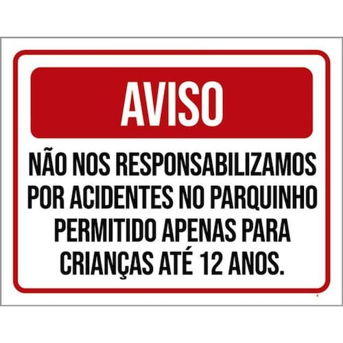 Kit 3 Placa Não Responsabilizamos Acidentes Parquinho 36x46 Placas de sinalizaço fabricadas com poliestireno de alto impacto PSAI de 2mm e impressão ultravioleta.
