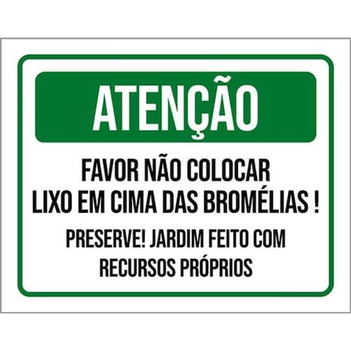 Kit 3 Placas Atenção Não Colocar Lixo Nas Bromélias 36x46 Placas de sinalizaço fabricadas com poliestireno de alto impacto PSAI de 2mm e impressão ultravioleta.