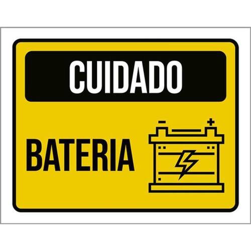 Kit 3 Placas Cuidado Bateria Amarela Ícone 36x46 Placas de sinalizaço fabricadas com poliestireno de alto impacto PSAI de 2mm e impressão ultravioleta.