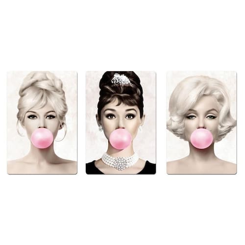 Kit 3 Placas Decorativas Personalidades Bubble Gum- 20X30Cm As placas decorativas são peças, na maioria das vezes colocadas na parede, com o objetivo de trazer uma personalidade e harmonia para o ambiente, além de serem mais em conta do que os quadros emoldurados e são muito mais versáteis. São muito fáceis de limpar. Apenas um pano molhado com sabão neutro já basta para limpá-las, pois não aderem muito poeira. Nunca utilize produtos com cloro, solvente ou produtos abrasivos, pois devido a química, pode estragar sua peça. Material: MDF ecológico de 3mm; Impressão: Digital fosco acetinado; Corte a laser com cantos arredondados; Tamanho: 20X30 cm cada peça; Kit 3 Placas Acompanha fita dupla face não é necessário furar a parede . Marca: Limeart Print Ean: 7891234367198