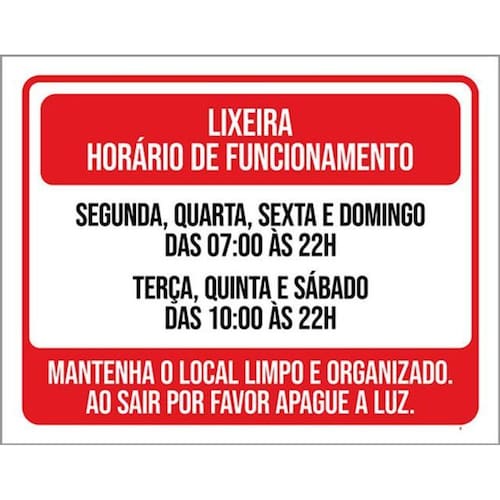 Kit 3 Placas Lixeira Horário Funcionamento Local Limpo Placas de sinalizaço fabricadas com poliestireno de alto impacto PSAI de 2mm e impressão ultravioleta.