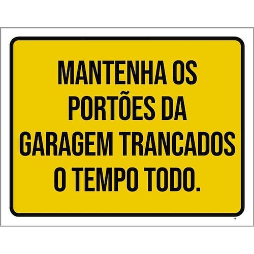 Kit 3 Placas Mantenha Portões Garagem Trancados Tempo Todo Placas de sinalizaço fabricadas com poliestireno de alto impacto PSAI de 2mm e impressão ultravioleta.