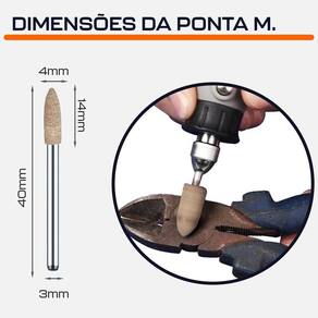 Kit 3 Pontas Montadas 4mm Cônica de Couro Haste 3mm para Polimento com Micro Retíficas Dremax - Marca: Dremax - Jogo exclusivo com 3 pontas montadas - Material: Couro de Vaca - Indicado para acabamento e polimento - Diâmetro da haste: 3mm - Diâmetro da ponta: 4mm - Altura da ponta: 14mm - Comprimento total: 40mm - Gramatura: Grão 180 - Formato: Cônica Ponta de Bala - As pontas montadas rosa são indicadas para uso geral - Uso em micro retíficas de qualquer marca com mandril de 3mm - Indicada para afiação, esmerilhamento e desbaste em metais, joias, pedras preciosas, vidro, entre outros materiais - Seu formato facilita o trabalho em locais de difícil acesso - Garantia: 90 dias contra defeitos de fabricação A DREMAX é a primeira e única marca brasileira dedicada exclusivamente às micro retíficas, acessórios e acoplamentos para esta indispensável ferramenta. Seja para trabalhos de precisão, artesanato, modelagem ou reparos, a DREMAX tem o produto certo para você - Ponta Montada Amarela: Alta dureza para polimento fino. Grão 240 - Ponta montada Azul: :Alta dureza para acabamento médio. Grão 150 - Ponta Montadas Rosa: Alta dureza e tenacidade acabamento grosso Grão. 120 - Ponta Montada Borracha Verde: Flexível, para retificação e polimento precisos. Grão 150 - Ponta Montada de Couro: Desempenho melhor do que a ponta de borracha verde, também ideal para polimento. Grão 180 - Ponta Montada Borracha com Abrasivos: Retificação mais nítida e rápida. Grão 120 - Ponta montada de Feltro: Polimento fino em metais e materiais não metálicos Marca: Dremax