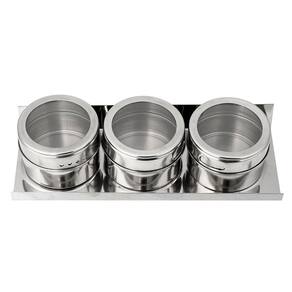 ESPECIFICAÇÕES: Material: Aço Inoxidável Comprimento da Base: 21cm Largura da Base: 7,5cm Diâmetro dos Frascos: 6,5cm Altura dos Frasco: 4,5cm Peso individual dos Frascos: 58g Peso da Base: 96g Peso Total: 274g Cor: Cinza Metálico