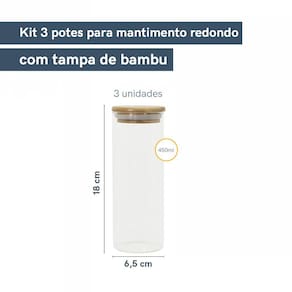 Esse conjunto contém 3 peças: 3 unidades - POTE 450ML DE VIDRO COM TAMPA DE BAMBU CIRCULAR MANTIMENTO - OIKOS Diâmetro: 6,5cm / Altura: 18cm